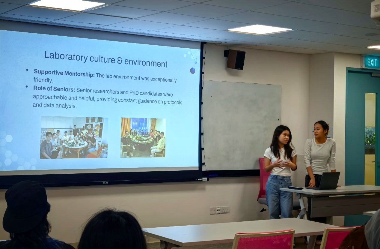 已顺利完成4名新加坡籍学生的实习项目。宣讲会上,曾参与该项目的学生Zhi Qi和Clare应邀分享了在我校的实习体验。她们结合科研实践与日常生活,从专业指导、文化融入等多个角度,生动讲述了实习期间的收获与成长。