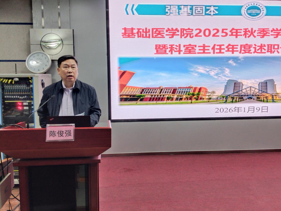 陈俊强同志对学院2025年取得的工作成效予以了充分肯定,向学院全体教职员工表达感谢和慰问。他结合学校的总体战略部署和学院发展的实际情况,对学院“十五五”时期需要重点谋划和突破的工作提出五点要求:一是要高站位谋划“十五五”发展蓝图,明确战略方向与实施路径;二是要高强度推进学科内涵建设,力争关键指标取得突破;三是要高标准打造一流师资队伍,构筑人才发展新高地;四是高质量深化教育教学改革,筑牢卓越医学人才培养根基;五是要高要求筑牢安全稳定防线,保障学院事业行稳致远。